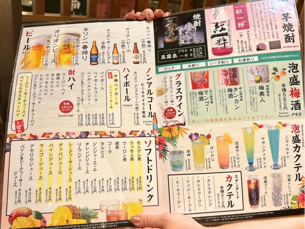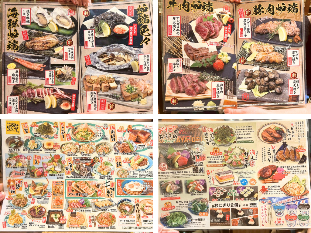 沖縄ならではの料理(あぐー豚ステーキ、ゴーヤーチャンプルー、海ぶどうなど)や、炭火の炉端焼きメニューも充実しています。