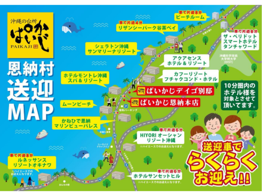 トゥクトゥクで近隣ホテルへ送迎をしてくれるそうですが、送迎エリアは以下のとおり。